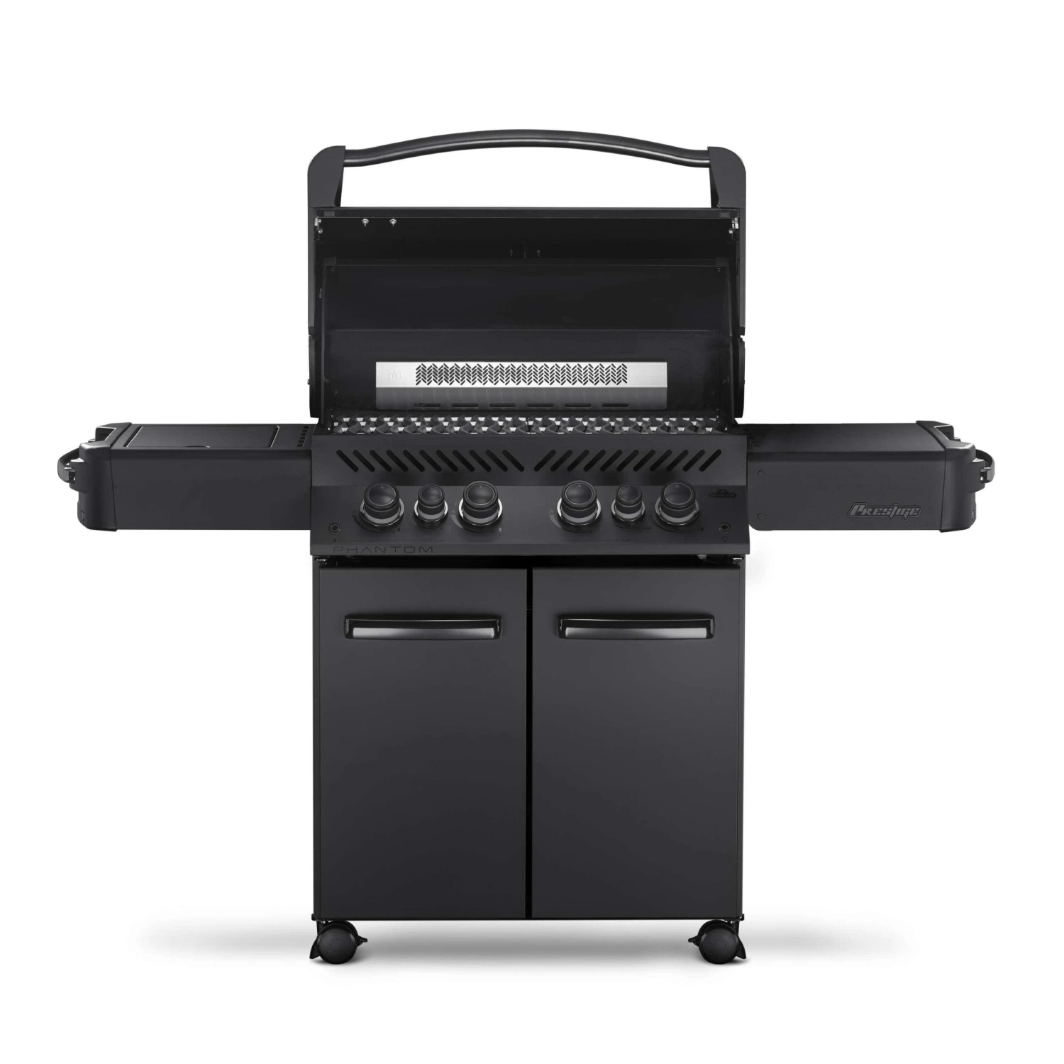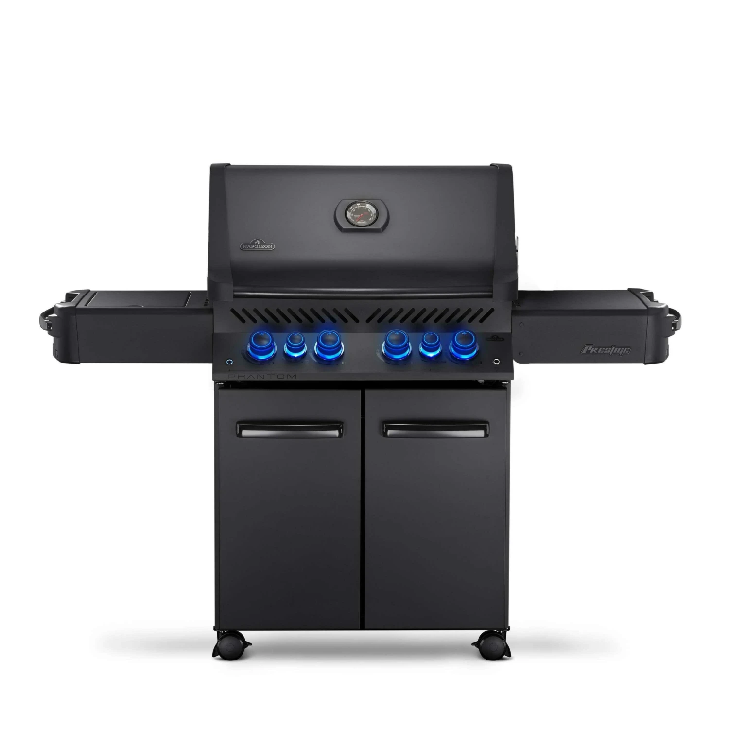 De Napoleon Phantom Prestige 500 gasbarbecue in de kleur matt black is een praktische barbecue die werkt op propaangas. Deze Napoleon gasbarbecue beschikt over een plaats besparende en gemakkelijk te openen deksel. Ook heeft de barbecue een kastruimte waar u uw accessoires en gasfles gemakkelijk in op kunt bergen. De gasbarbecue heeft twee zijtafels waarvan de rechterkant inklapbaar is zodat de grill gemakkelijker op te bergen is. De linkerzijtafel beschikt over een zijbrander waarop u de heerlijkste sausjes en bijgerechten kunt bereiden. Door de SafetyGlow bedieningsknoppen zal u nooit vergeten uw barbecue uit te zetten, deze gloeien namelijk rood wanneer de brander aan staat.