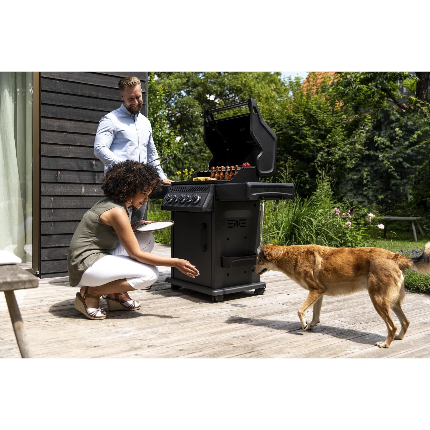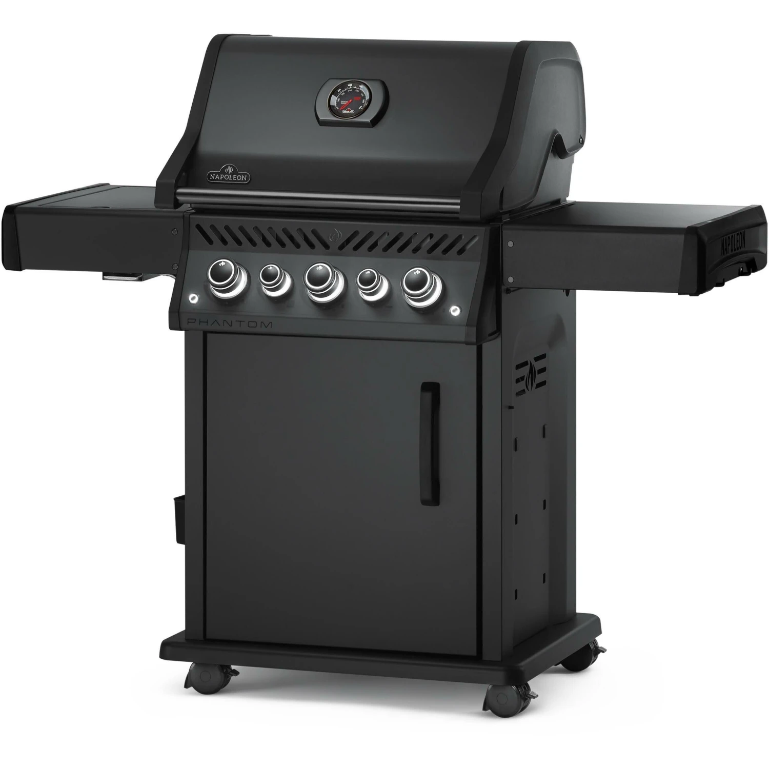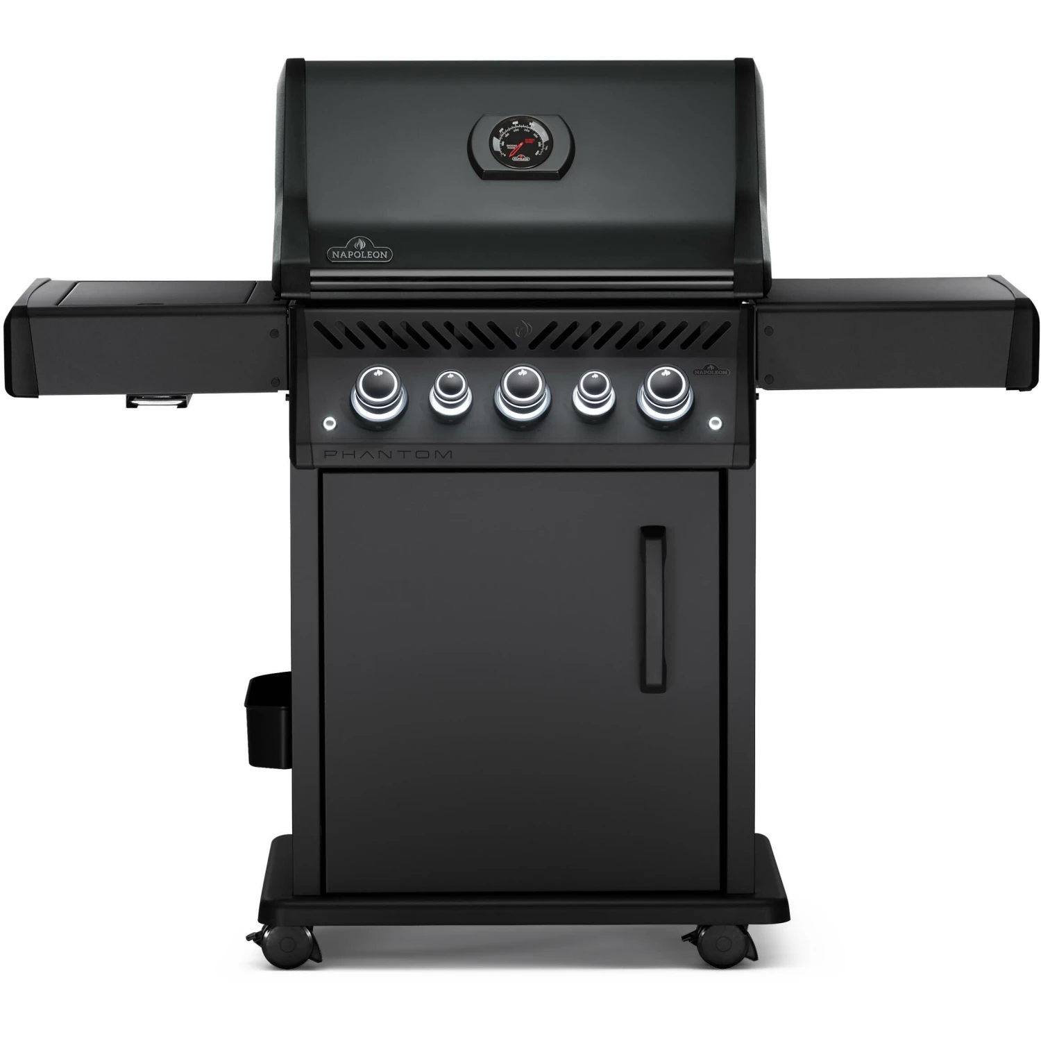 De Napoleon Phantom Rogue SE 425 gasbarbecue in de kleur matt black is een echte eyecatcher voor iedere tuin. Deze Napoleon gasbarbecue is een ruime buitenkeuken met praktische eigenschappen zoals een thermometer in de deksel, gereedschapshaken, warmhoudrek en een ruime kast om bijvoorbeeld accessoires of de gasfles in op te bergen. Deze Napoleon barbecue heeft een zijtafel met Sizzle Zone infrarood zijbrander waarop temperaturen tot 800°C bereikt kunnen worden, ideaal voor het bereiden van een goede steak. De andere zijtafel is inklapbaar waardoor dit veel ruimte bespaard bij het opbergen, deze tafel is zeer geschikt om uw gerechten op voor te bereiden.