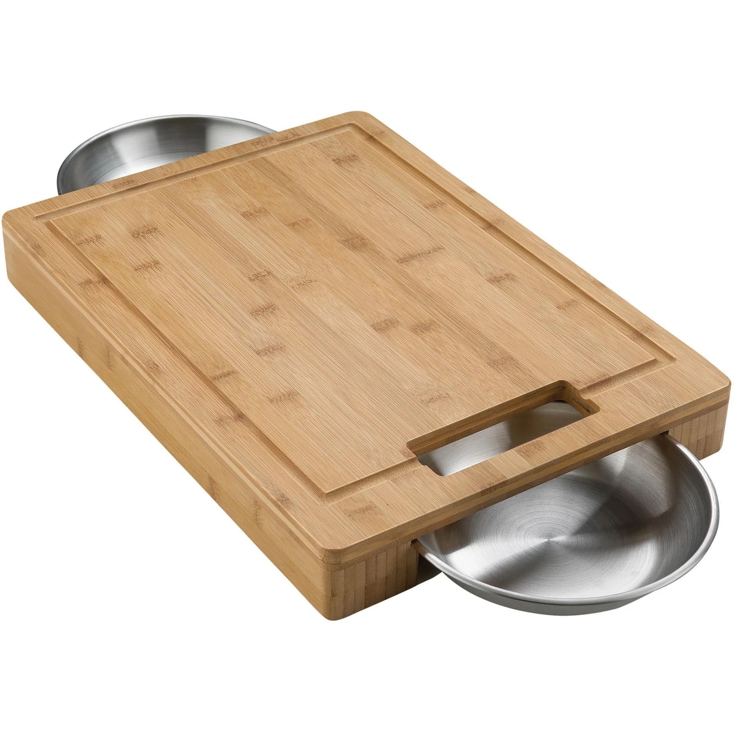 De Napoleon Pro snijplank met schalen bestaat uit een snijplank van bamboe met daaraan twee RVS kommen. Deze Napoleon snijplank heeft een antibacterieel oppervlakte waardoor deze perfect is voor het bereiden van voedsel. De snijplank heeft een trog die alle vleessappen opvangt en door het slimme ontwerp met de twee schalen kan dit gemakkelijk vanuit de plank in de schaaltjes opgevangen worden.